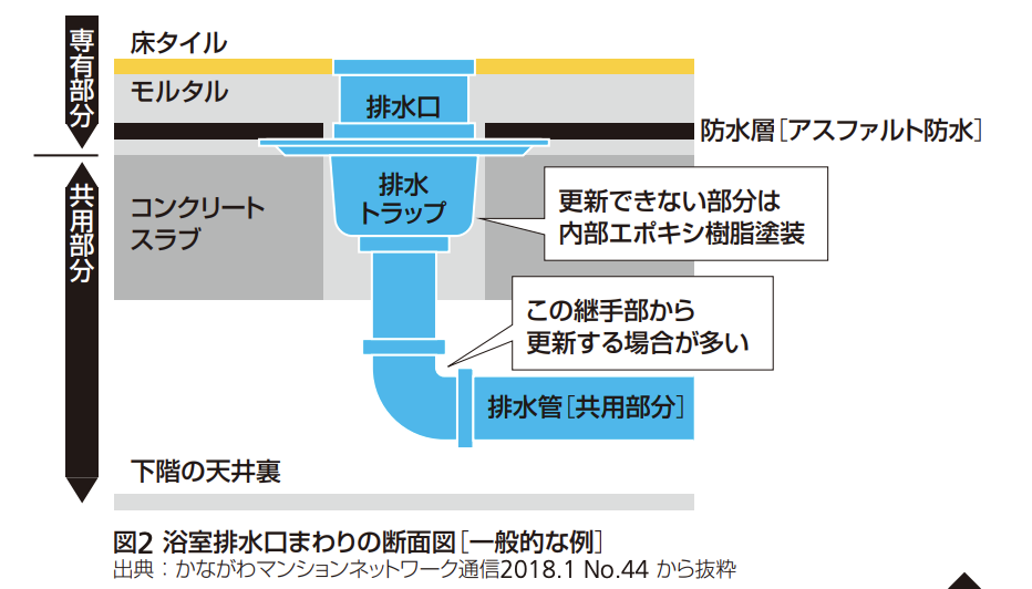 階下に躯体(スラブ)を貫通して設置されている排水管は階下の天井裏にあります。このスペース(空間)は共用部になります。(図2参照)これを明確にするために規約改定を行います。